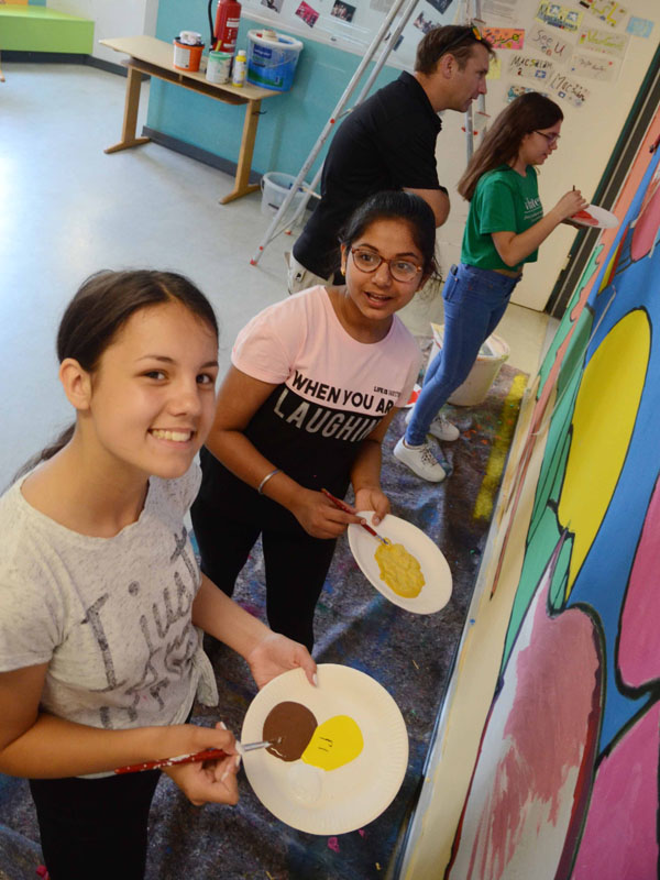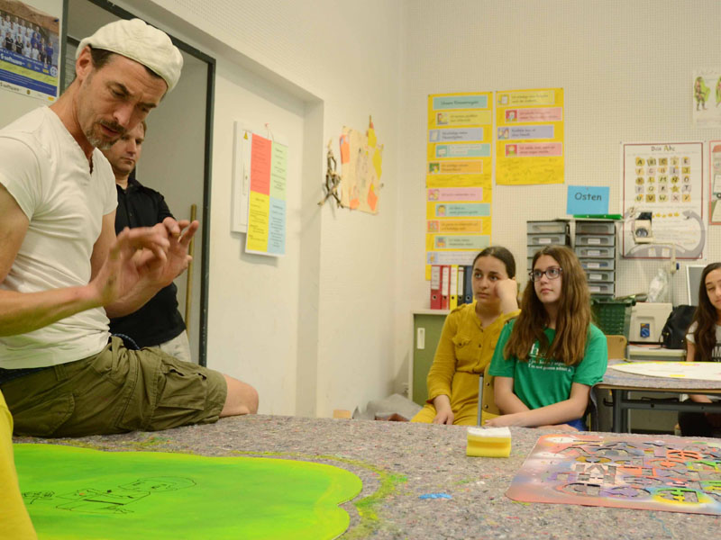 Unter dem Motto „Darmstadt ist…“ erarbeiteten Schülerinnen und Schüler einer Intensivklasse der Mornewegschule Darmstadt eigene Bildideen. Diese wurden in Gruppenarbeit diskutiert und visualisiert. Als Gestaltungsfläche stand eine großflächige Wand im öffentlich zugänglichen Schulflur zur Verfügung. Diese wurde im ersten Schritt mit einem Baum und Landschaft gestaltet und diente als Bildfläche für individuelle Themeninterpretationen. Hierbei gestalteten die Teilnehmer/-innen im Team eigene Bildträger, die in Form von Luftballons und Wolken auf die Wandfläche montiert wurden. Somit ergab sich ein spannendes Wechselspiel zwischen Wand- und Objektgestaltung. Durch die fachkundige Leitung von Jörn Heilmann und Stefan Ritter wurden die Teams mit Gestaltungstechniken und großformatigem, künstlerischem Arbeiten konfrontiert. Problemlösungen ergaben sich durch den gemeinsamen Austausch und das mutige „Überspringen“ von scheinbaren Hindernissen. Ein Arbeiten im Prozess war somit Teil des Gestaltungskonzeptes. Ziel des Workshops war eine kreative Zusammenführung der Schüler/-innen fern ab von sprachlichen Barrieren. Aufgrund des multikulturellen Hintergrundes bestanden unterschiedliche Sprachkenntnisse, die durch den künstlerischen Ausdruck mit Farbe und Pinsel überwunden wurden und zur Bildung einer Gemeinschaft führten. Kreatives Teamwork mit nachhaltigem Charakter, das als Ergebnis in Form einer großflächigen Wandgestaltung für die gesamte Schulgemeinde sichtbar wurde.
